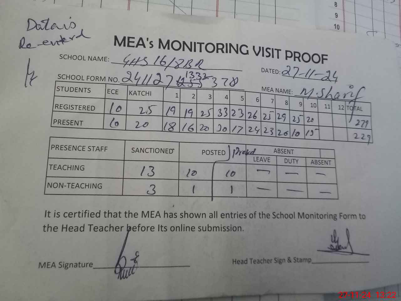 | Attendance Register | Head Teacher | MEA with School | Visit Proof |