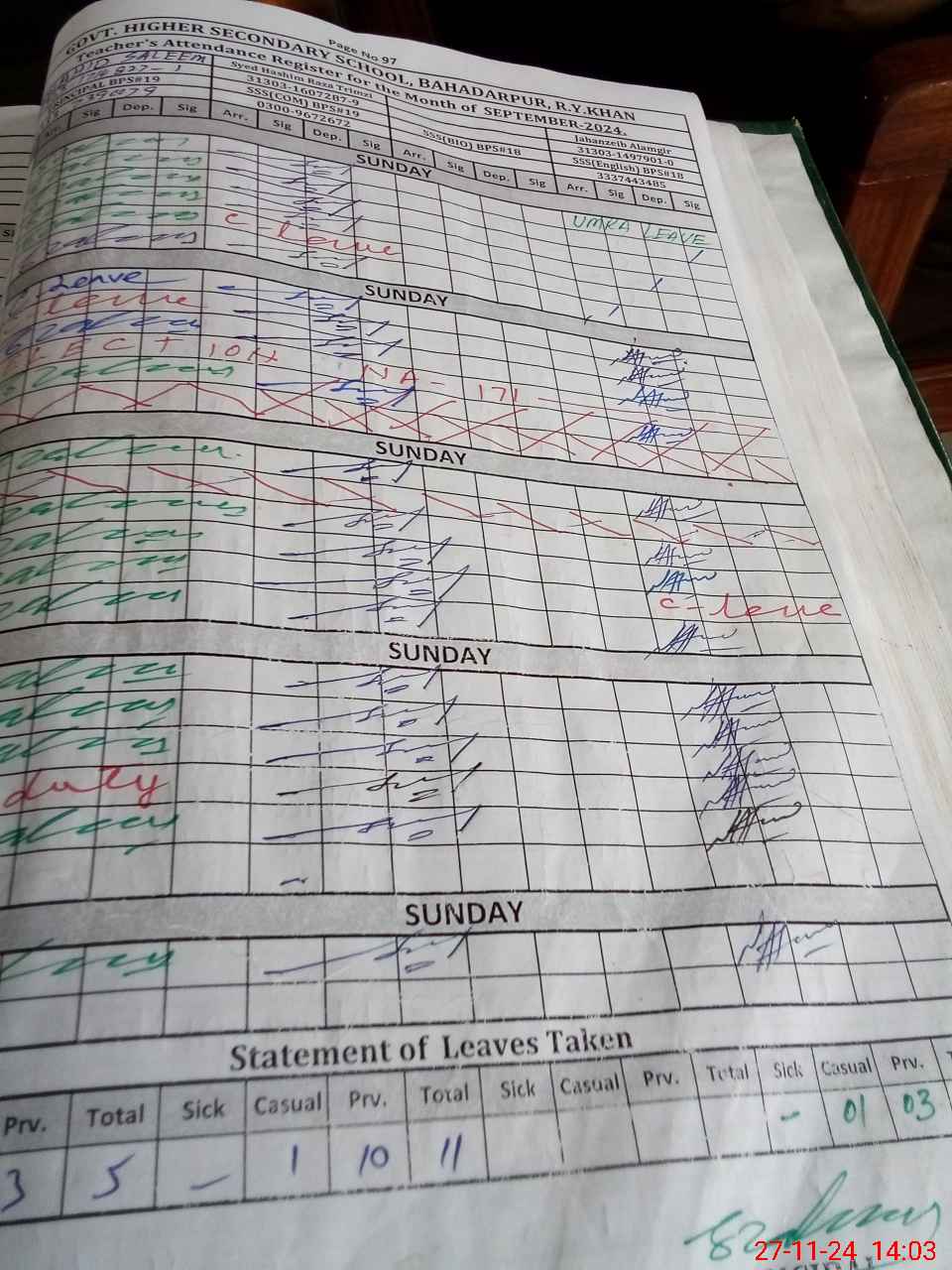 | CNIC | Full Name | Designation | R/C | Absence During Last Calender Month |