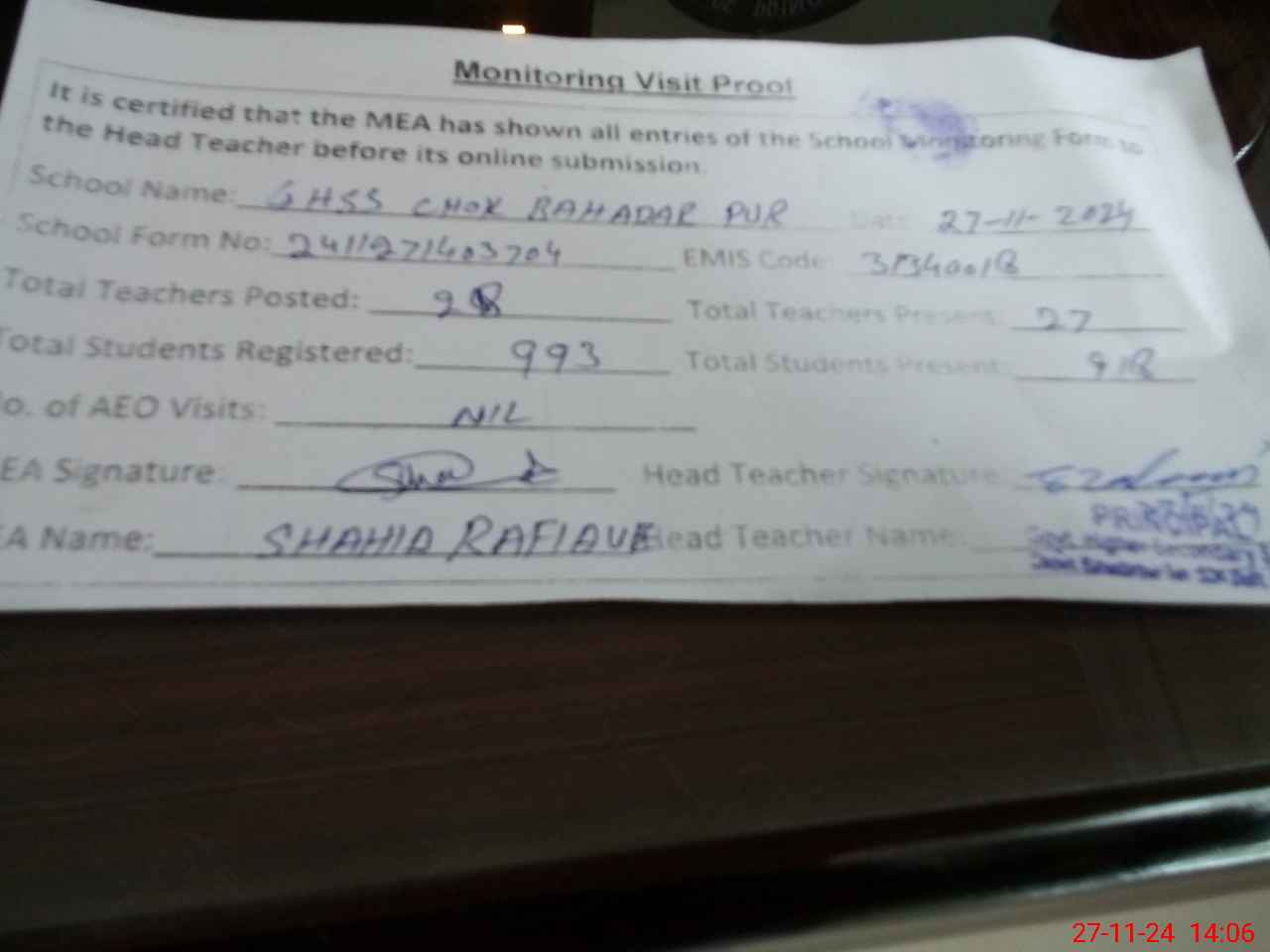 | Attendance Register | Head Teacher | MEA with School | Visit Proof |