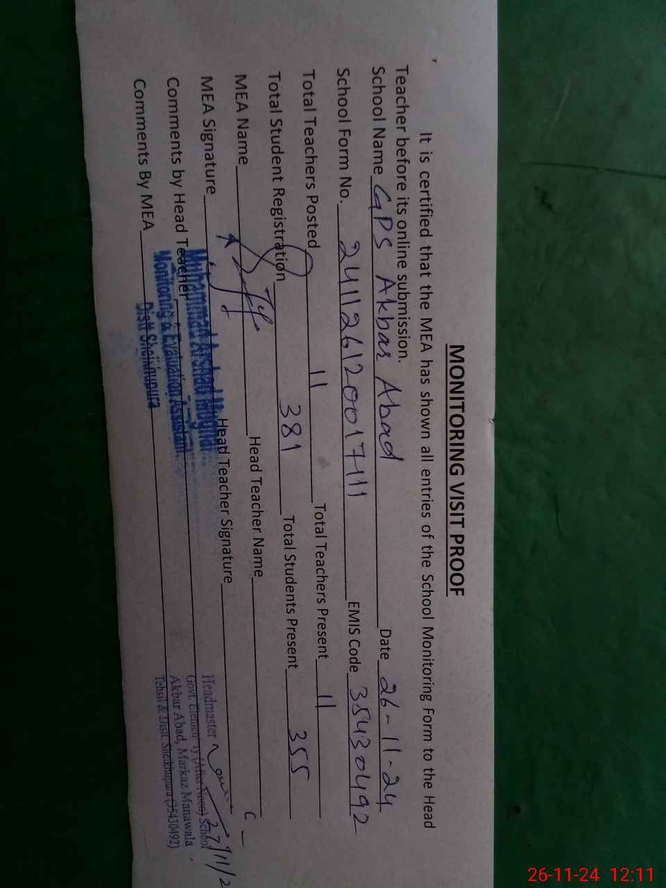 | Attendance Register | Head Teacher | MEA with School | Visit Proof |