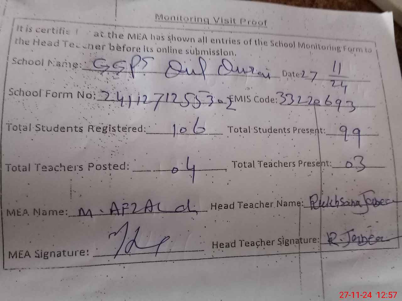 | Attendance Register | Head Teacher | MEA with School | Visit Proof |