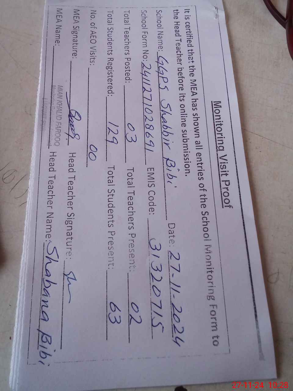 | EMIS Code: 31320715 | Name of School: GGPS SHABBIR ABAD | |||