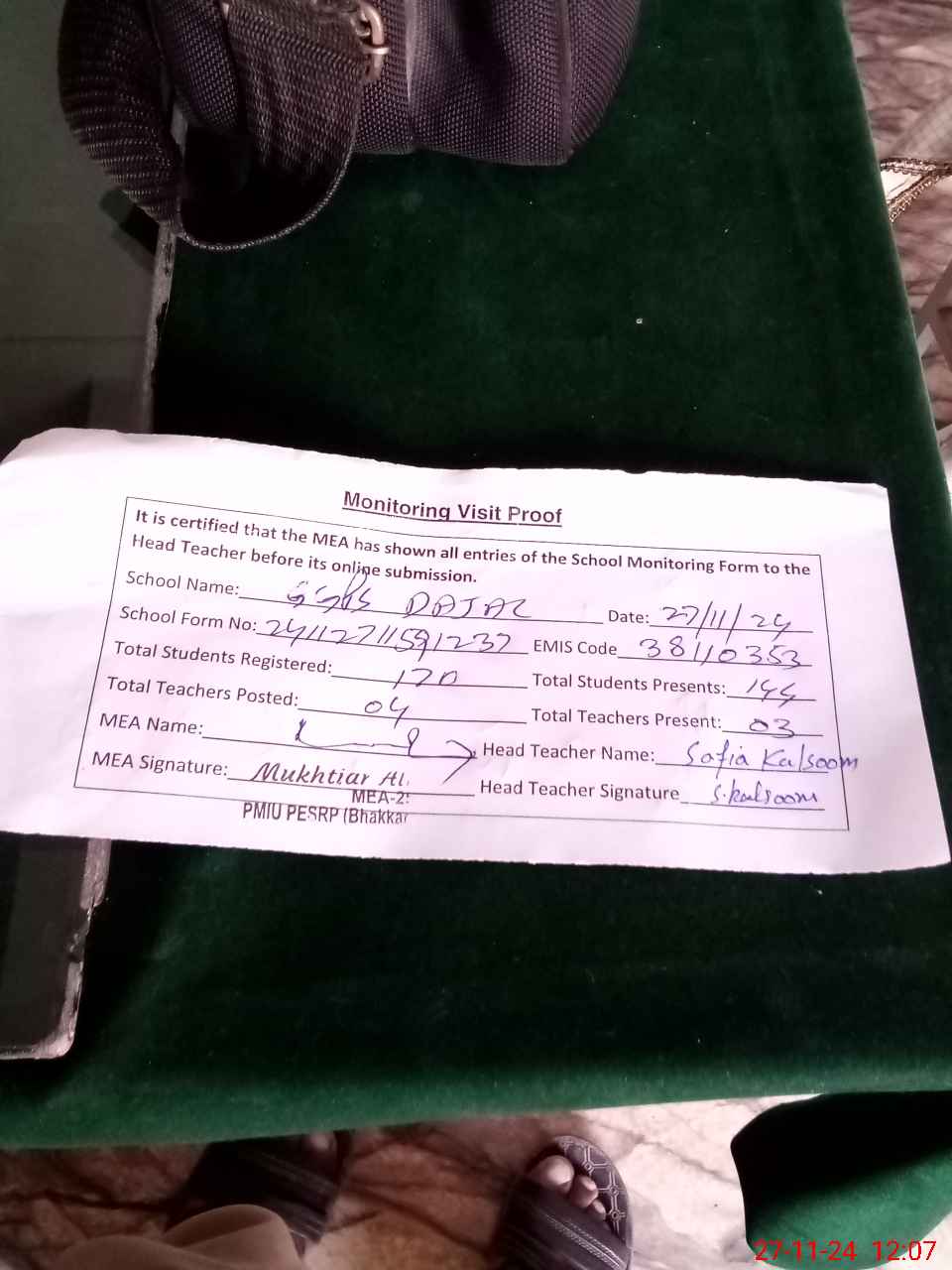| Monitoring Date: 27-11-2024 | Start Time: 27-11-2024 11:33 AM | End Time: 27-11-2024 12:08 PM | Name of MEA: Mu**** Al**** | |