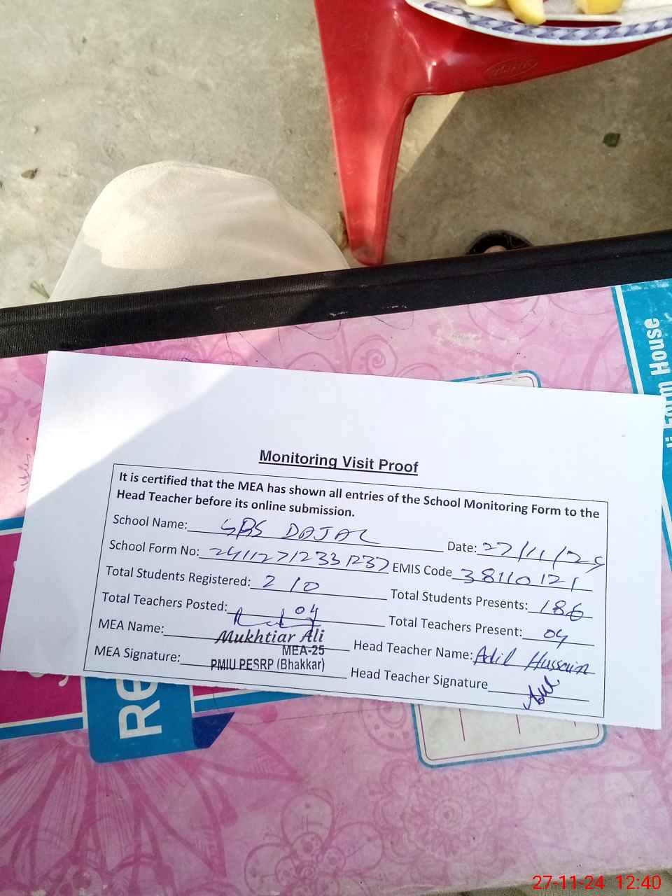 | Attendance Register | Head Teacher | MEA with School | Visit Proof |