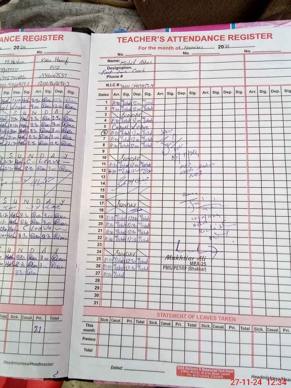 | Name: AB**** RA**** Designation: (School Headmaster's/Headmistress's) PTC/JV Phone/Cell Number: 03**** |