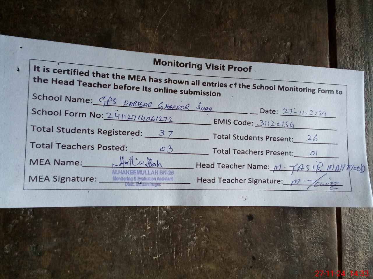 | EMIS Code: 31120154 | Name of School: GPS DARBAR GHAFOOR SHAH | |||