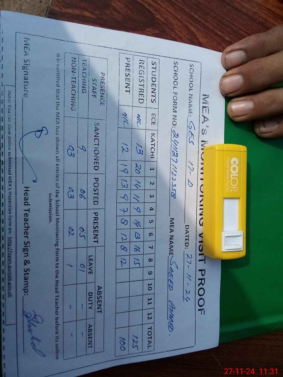 | Attendance Register | Head Teacher | MEA with School | Visit Proof |