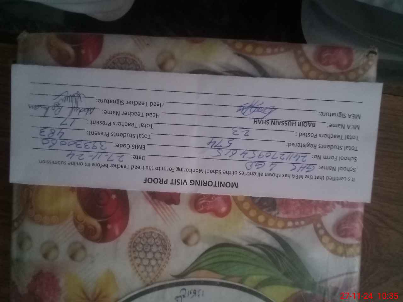 | Attendance Register | Head Teacher | MEA with School | Visit Proof |