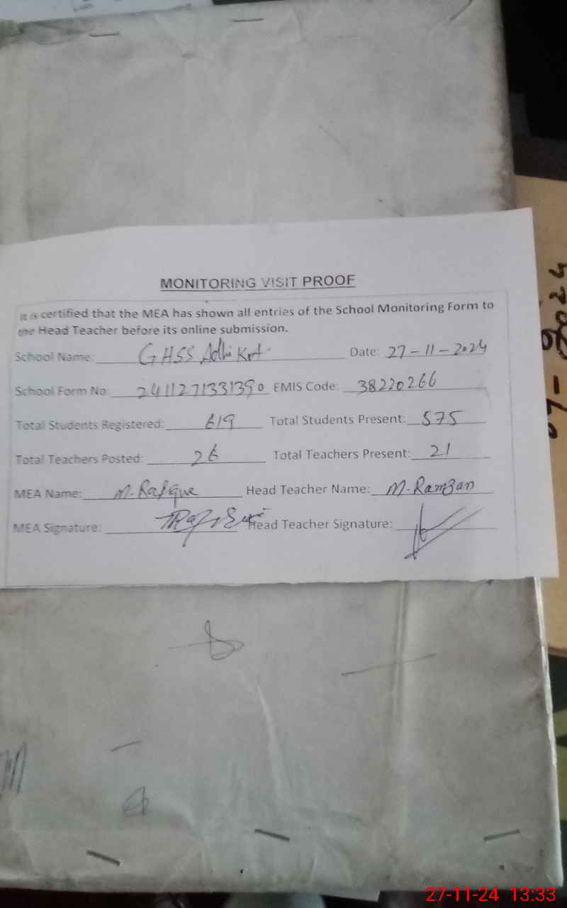 | EMIS Code: 38220266 | Name of School: GHSS ADHI KOT | |||