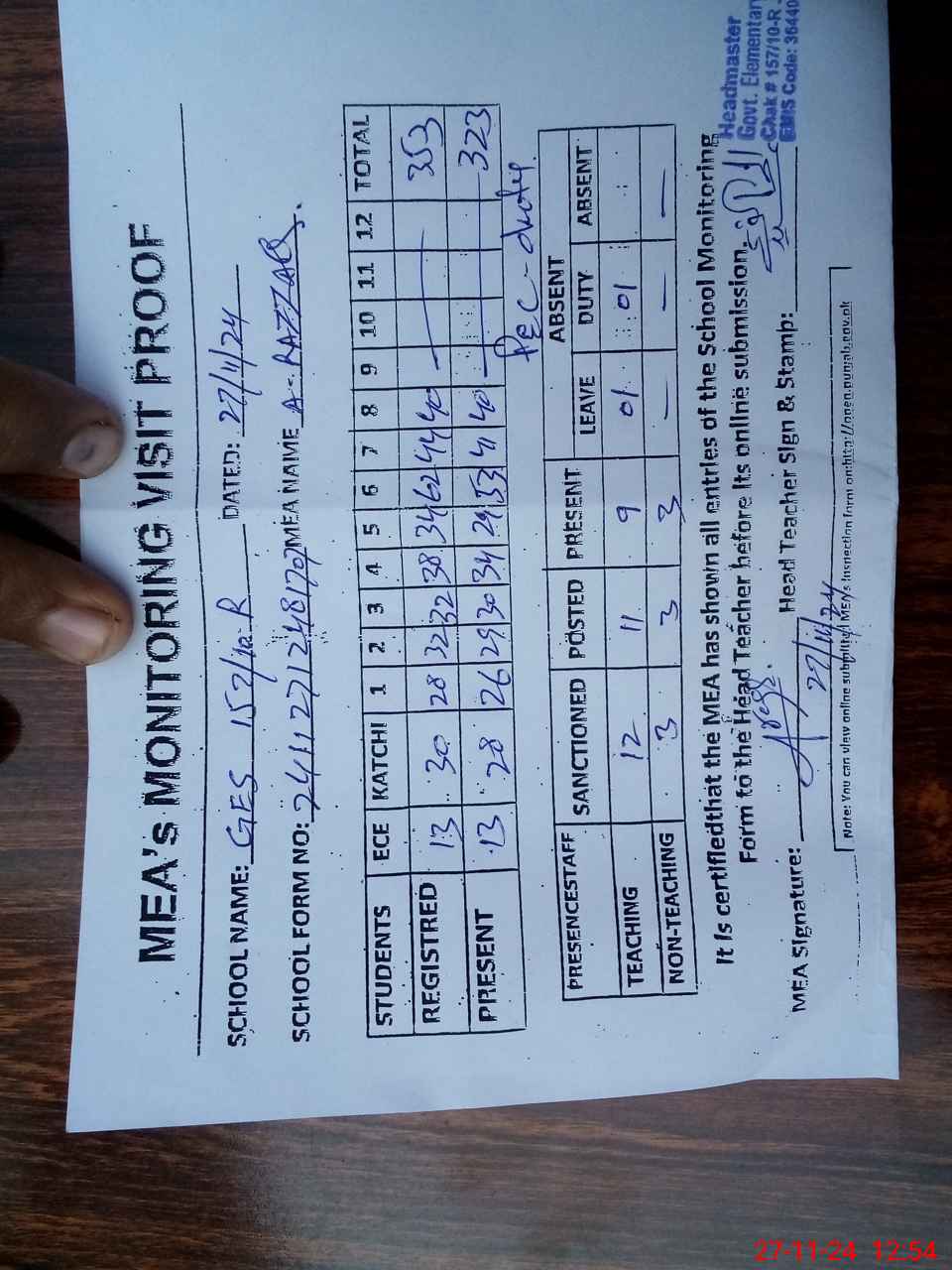 | Attendance Register | Head Teacher | MEA with School | Visit Proof |