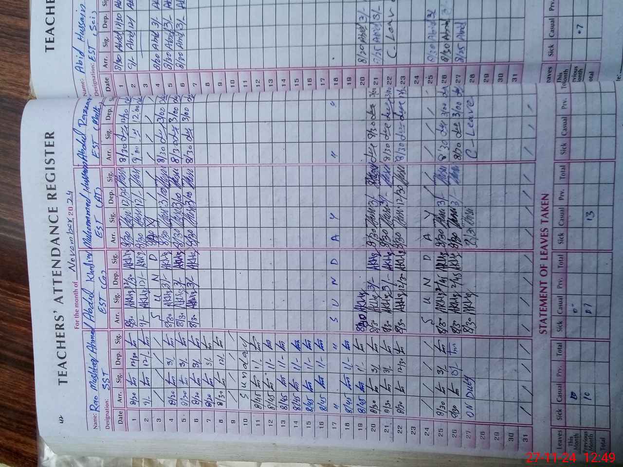 | CNIC | Full Name | Designation | R/C | Absence During Last Calender Month |