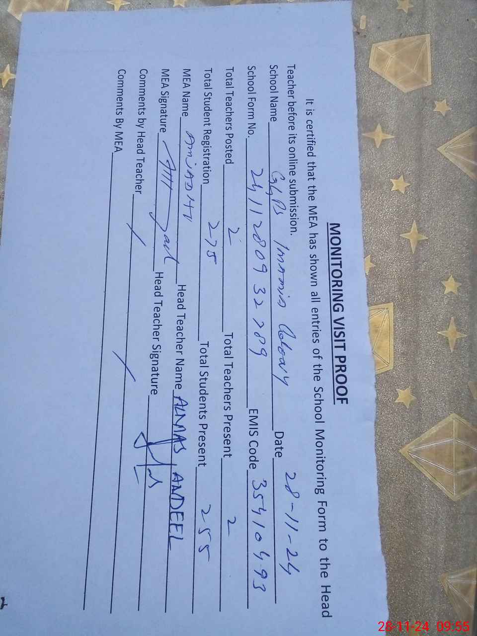 | Attendance Register | Head Teacher | MEA with School | Visit Proof |
