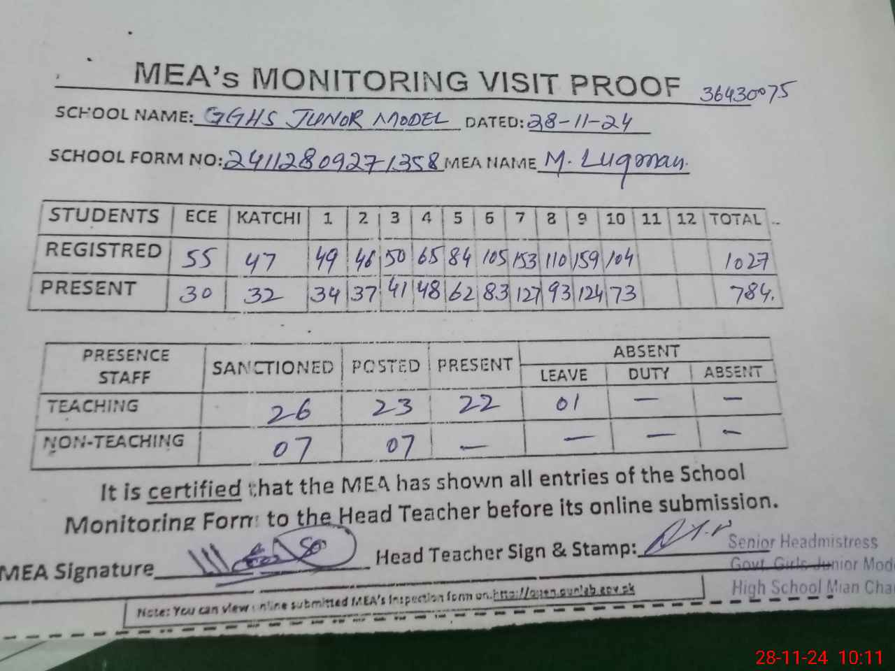 | Attendance Register | Head Teacher | MEA with School | Visit Proof |