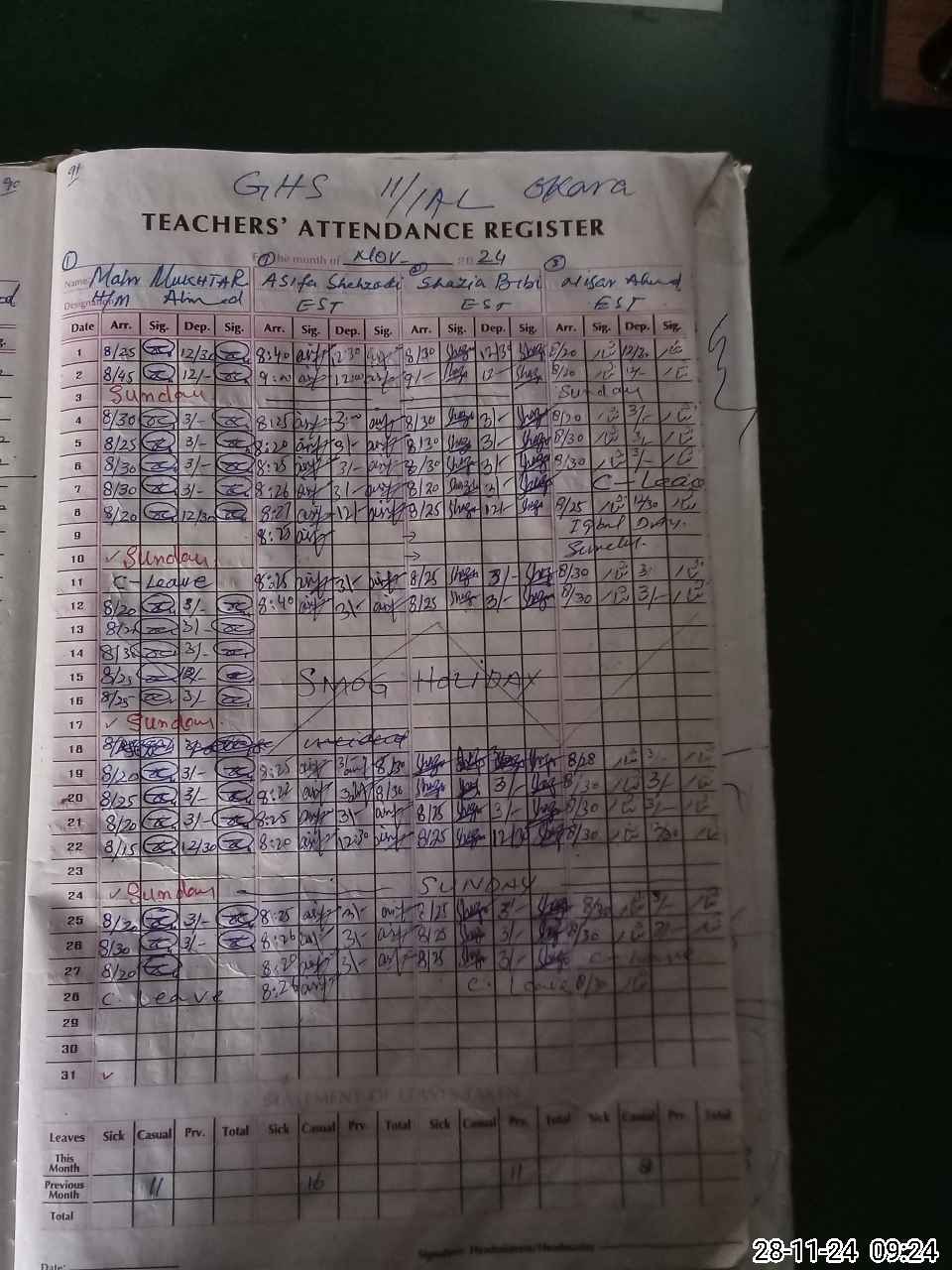 | Monitoring Date: 28-11-2024 | Start Time: 28-11-2024 09:20 AM | End Time: 28-11-2024 10:17 AM | Name of MEA: MU**** AH**** (R**** | |
