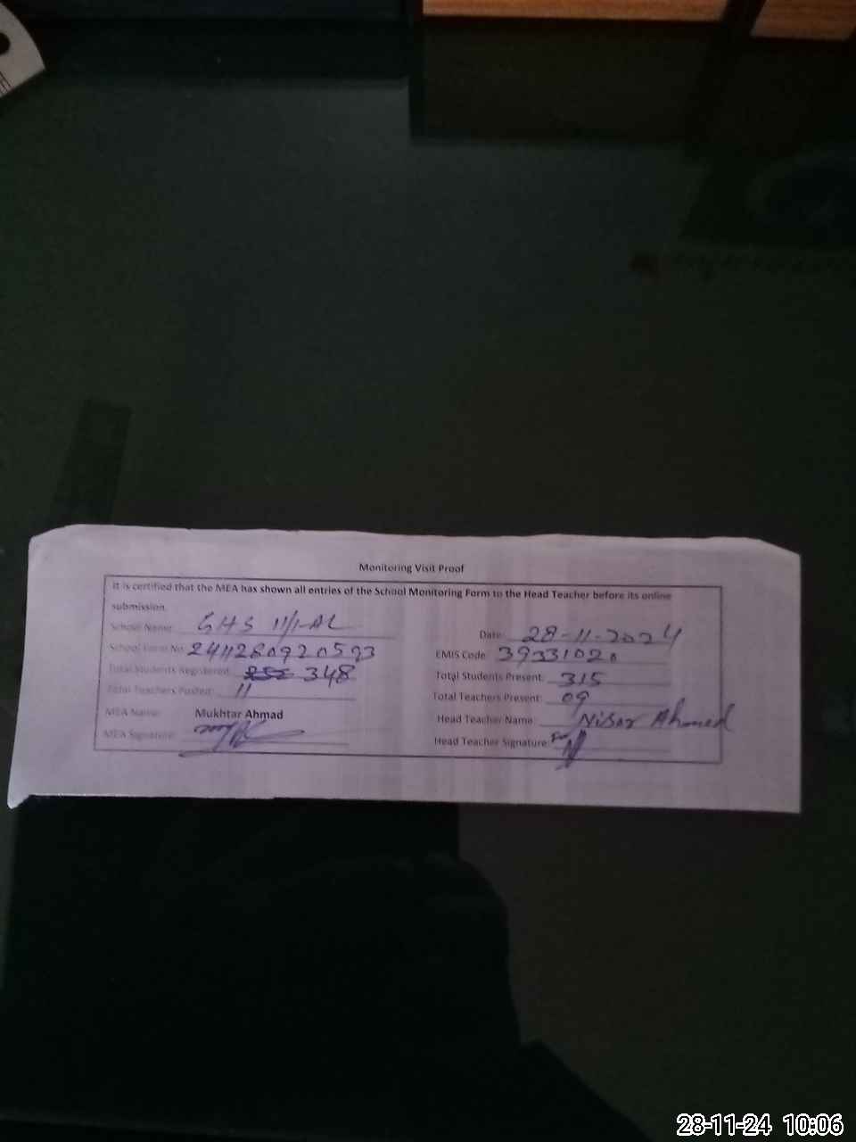 | Attendance Register | Head Teacher | MEA with School | Visit Proof |