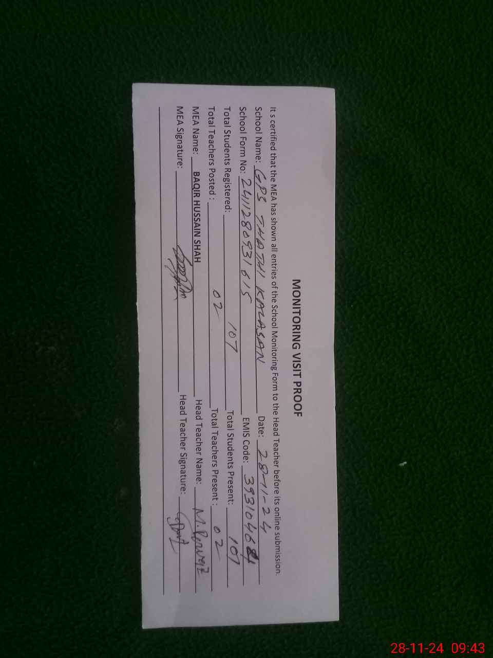 | Attendance Register | Head Teacher | MEA with School | Visit Proof |