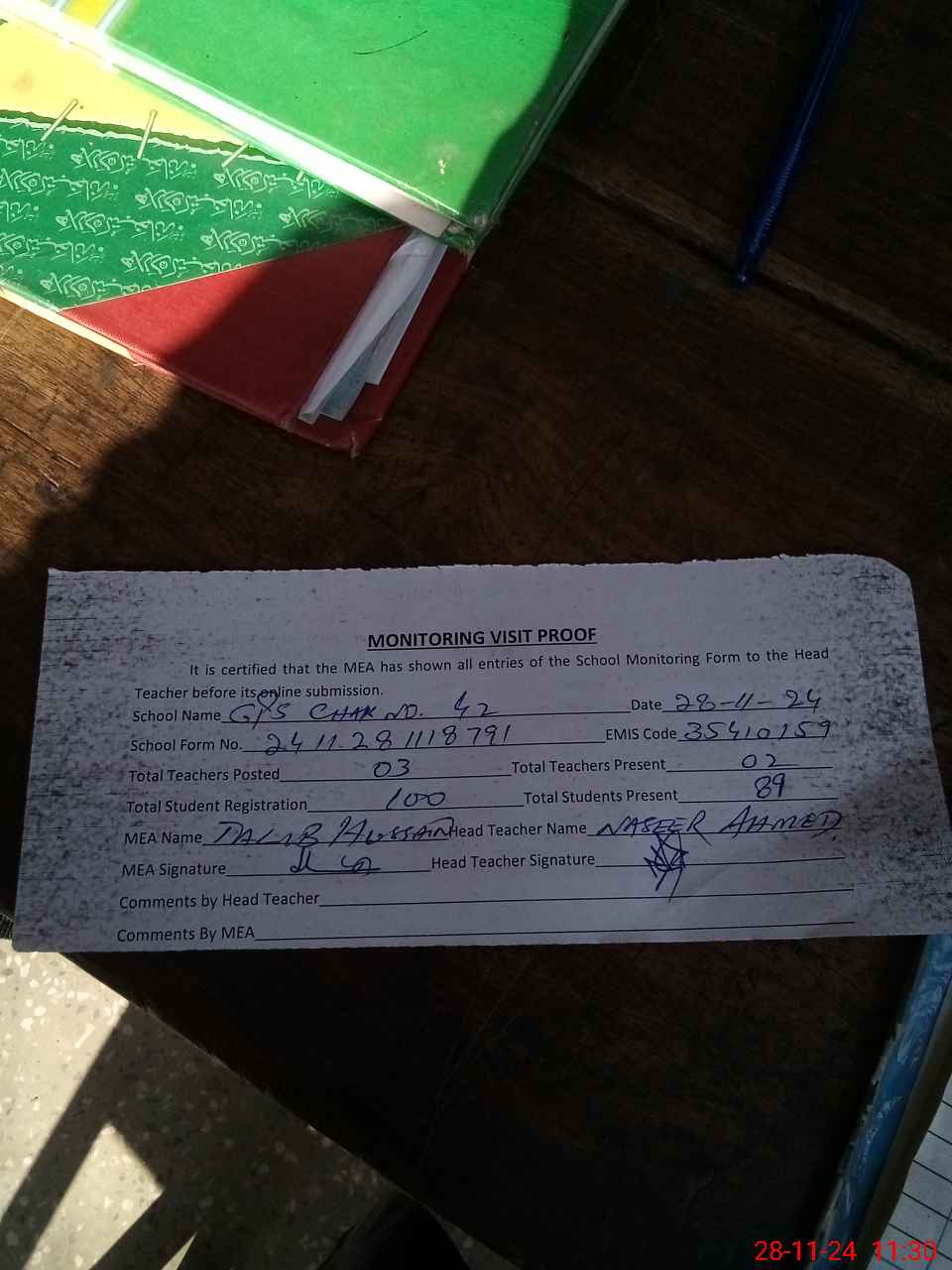 | Attendance Register | Head Teacher | MEA with School | Visit Proof |