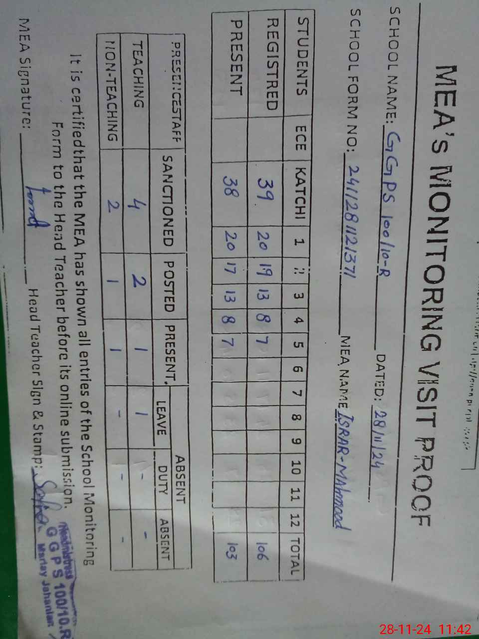 | Attendance Register | Head Teacher | MEA with School | Visit Proof |