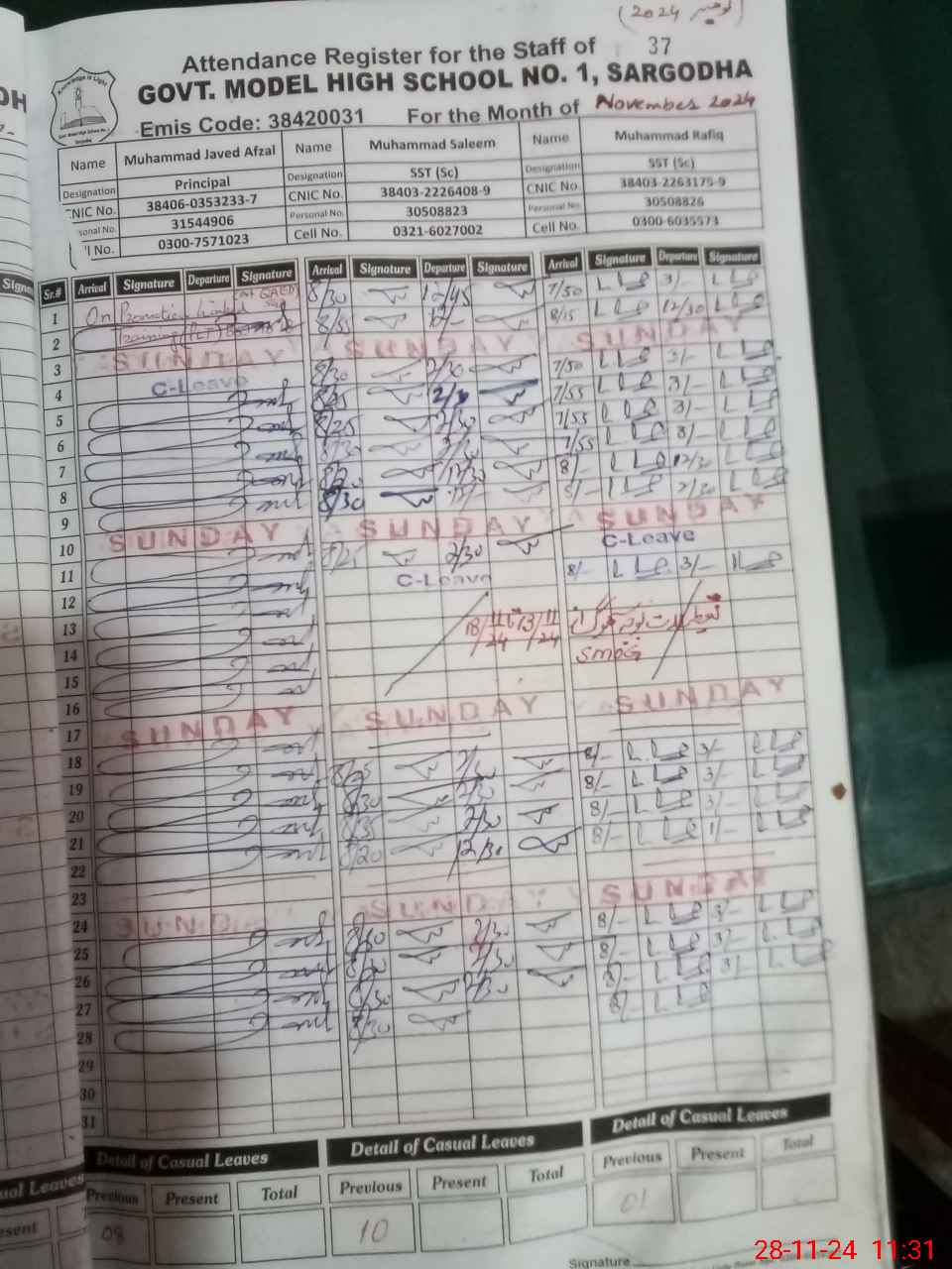 | CNIC | Full Name | Designation | R/C | Absence during last cal. month |
