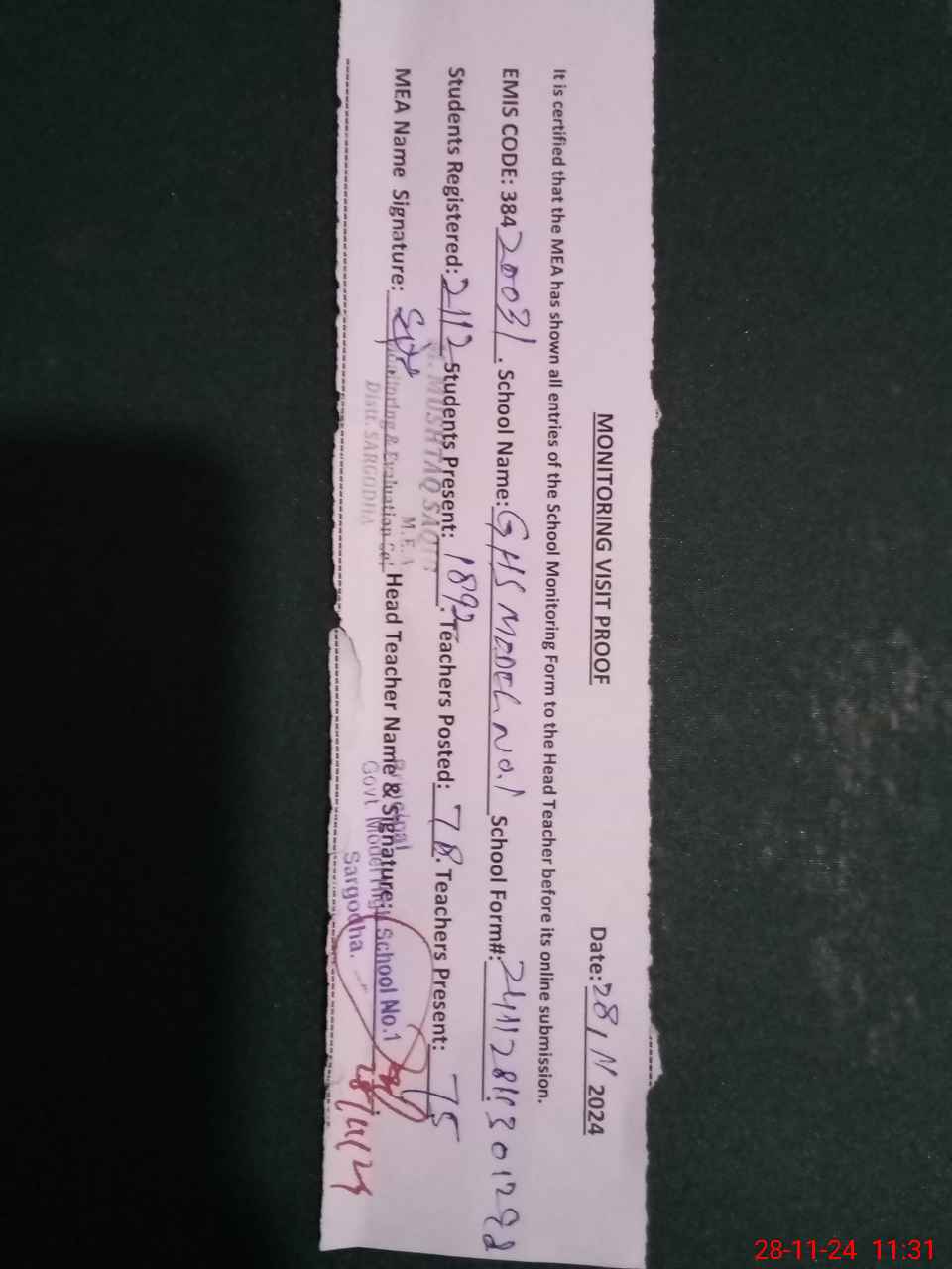 | Attendance Register | Head Teacher | MEA with School | Visit Proof |