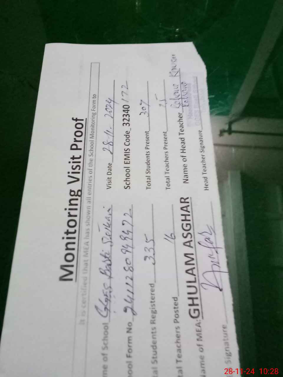 | Attendance Register | Head Teacher | MEA with School | Visit Proof |