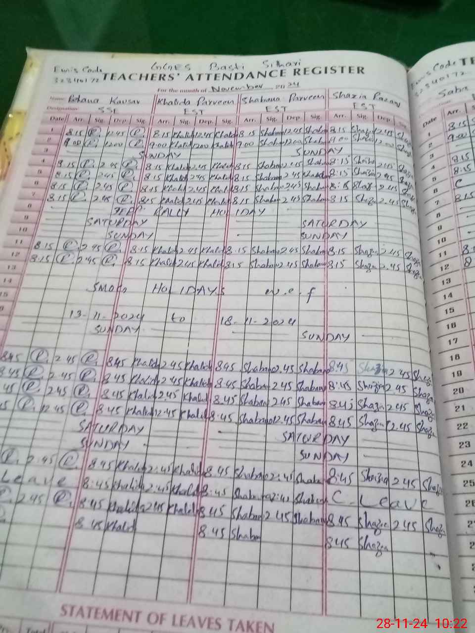 | Leave | Duty | Absent | Maternity | Medical | Ex- Pak |