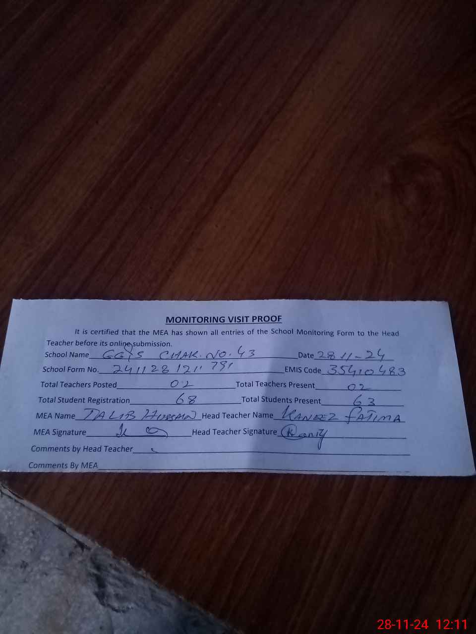 | Attendance Register | Head Teacher | MEA with School | Visit Proof |