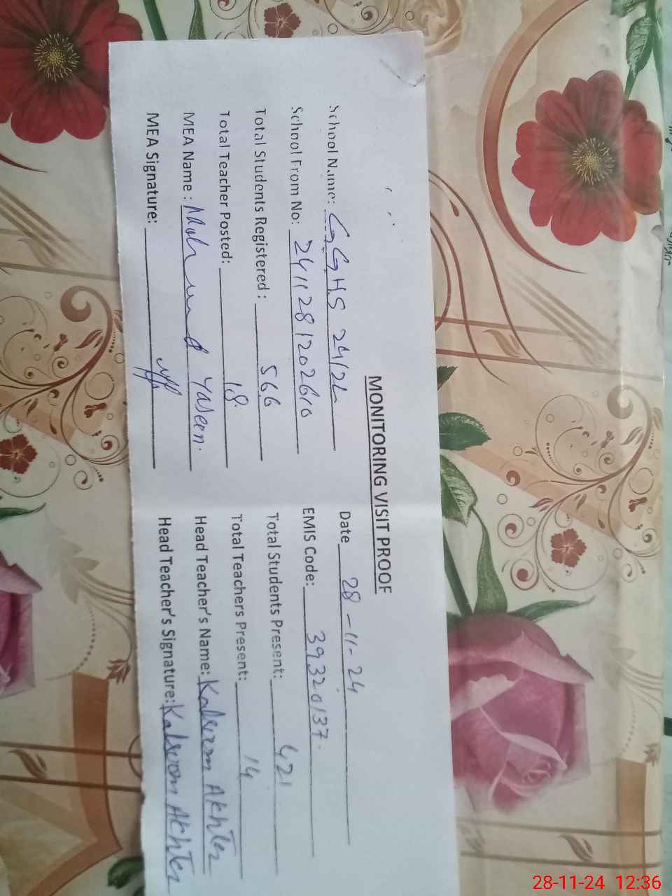 | Attendance Register | Head Teacher | MEA with School | Visit Proof |