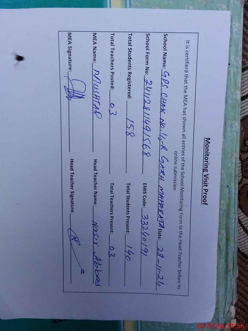 | Attendance Register | Head Teacher | MEA with School | Visit Proof |