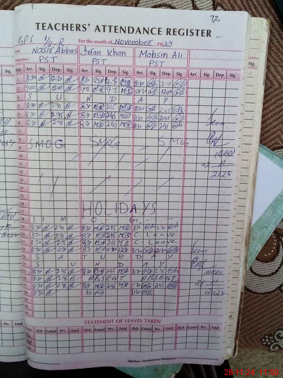 | CNIC | Full Name | Designation | R/C | Absence During Last Calender Month |