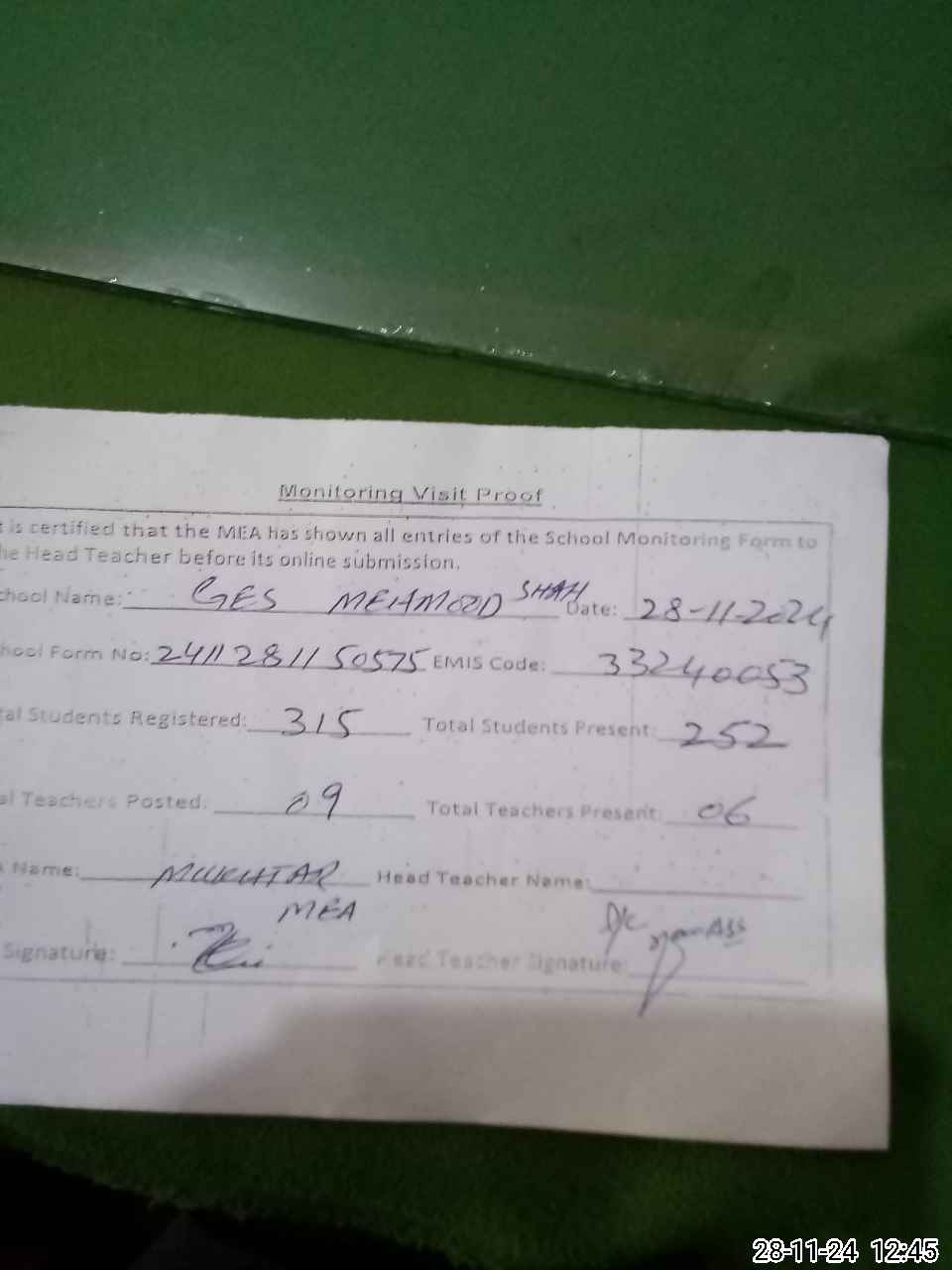 | Attendance Register | Head Teacher | MEA with School | Visit Proof |