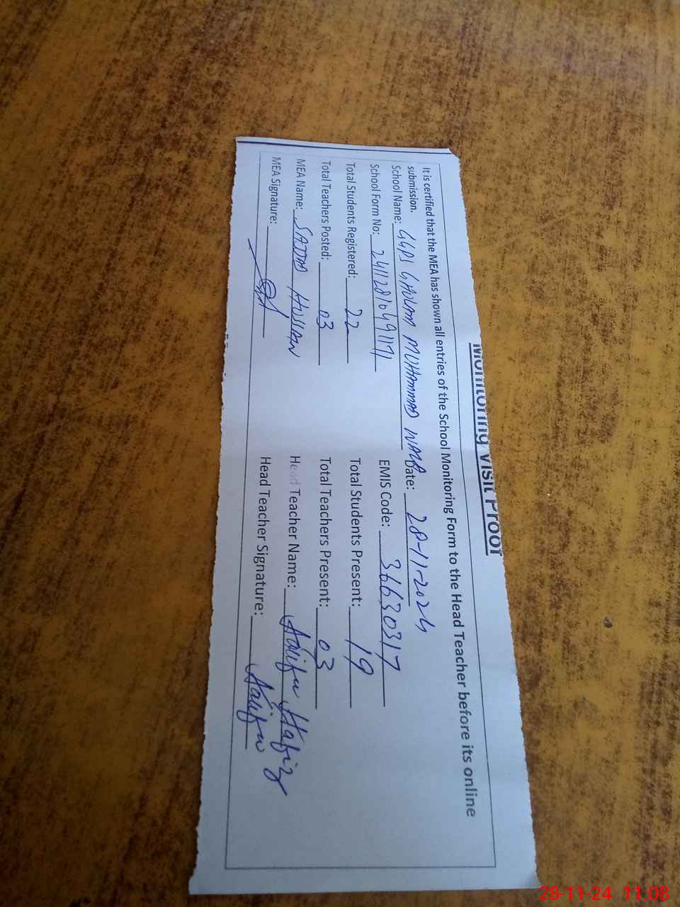 | Attendance Register | Head Teacher | MEA with School | Visit Proof |