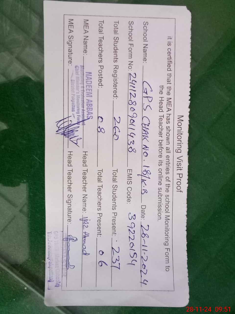 | EMIS Code: 39220154 | Name of School: GPS CHAK NO. 18 KB | |||