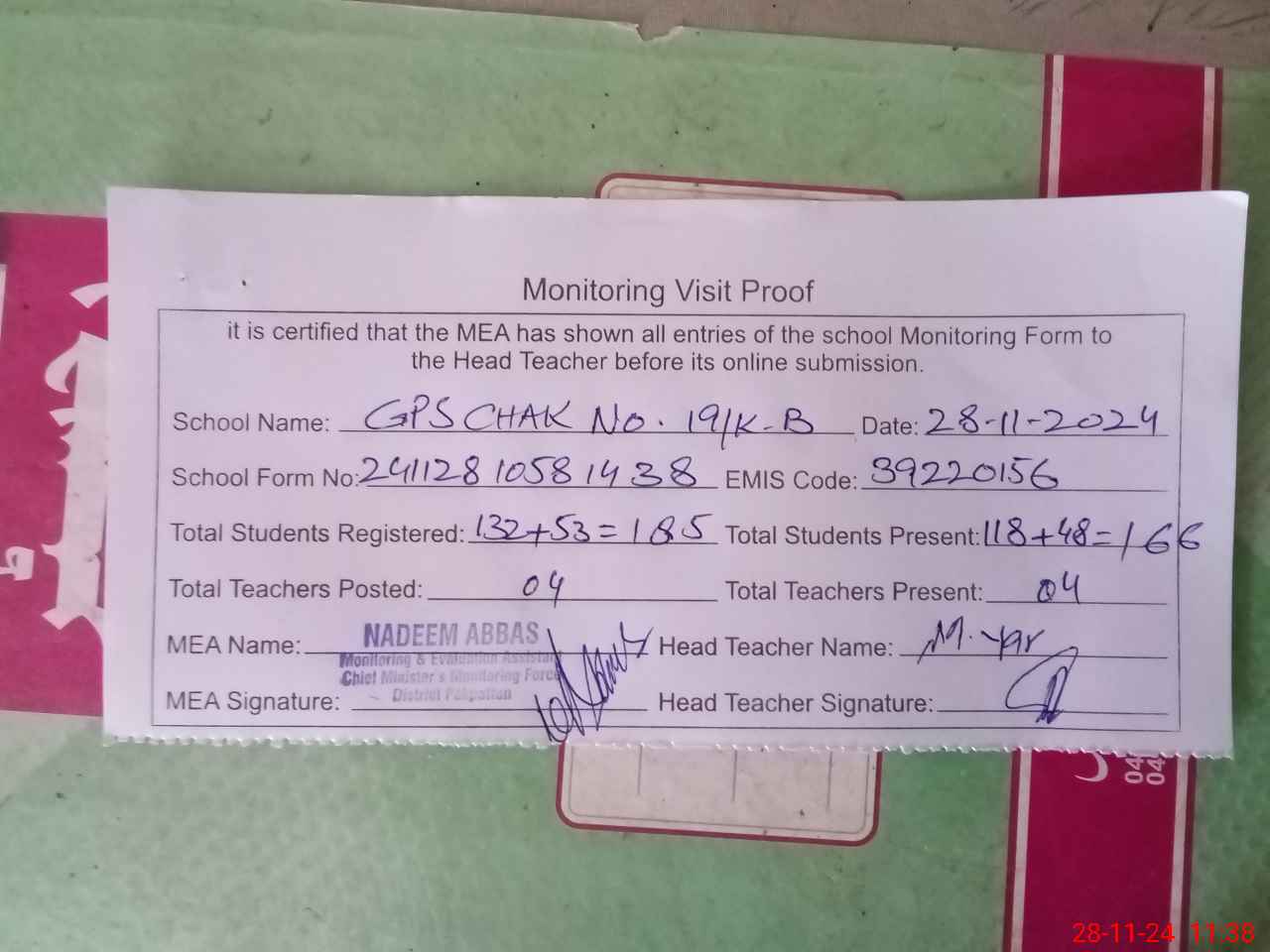 | Attendance Register | Head Teacher | MEA with School | Visit Proof |