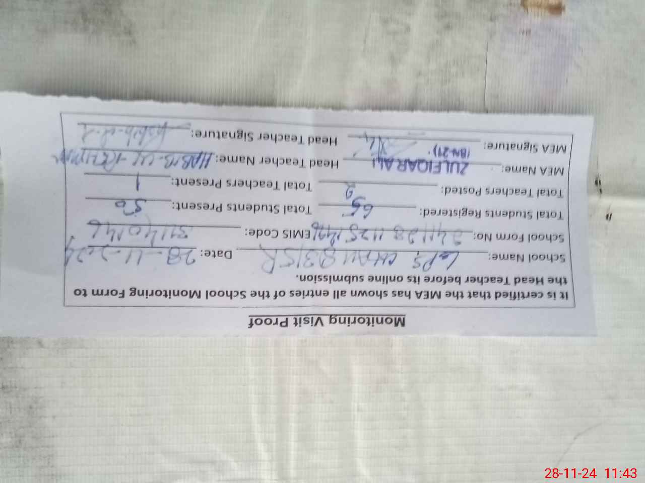 | Attendance Register | Head Teacher | MEA with School | Visit Proof |