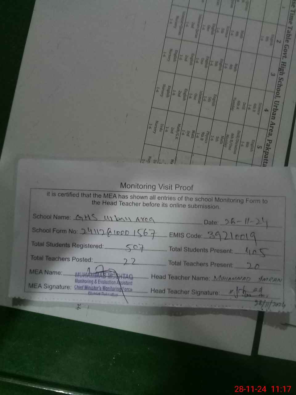 | EMIS Code: 39210019 | Name of School: GHS URBAN AREA ISLAM COLONY | |||