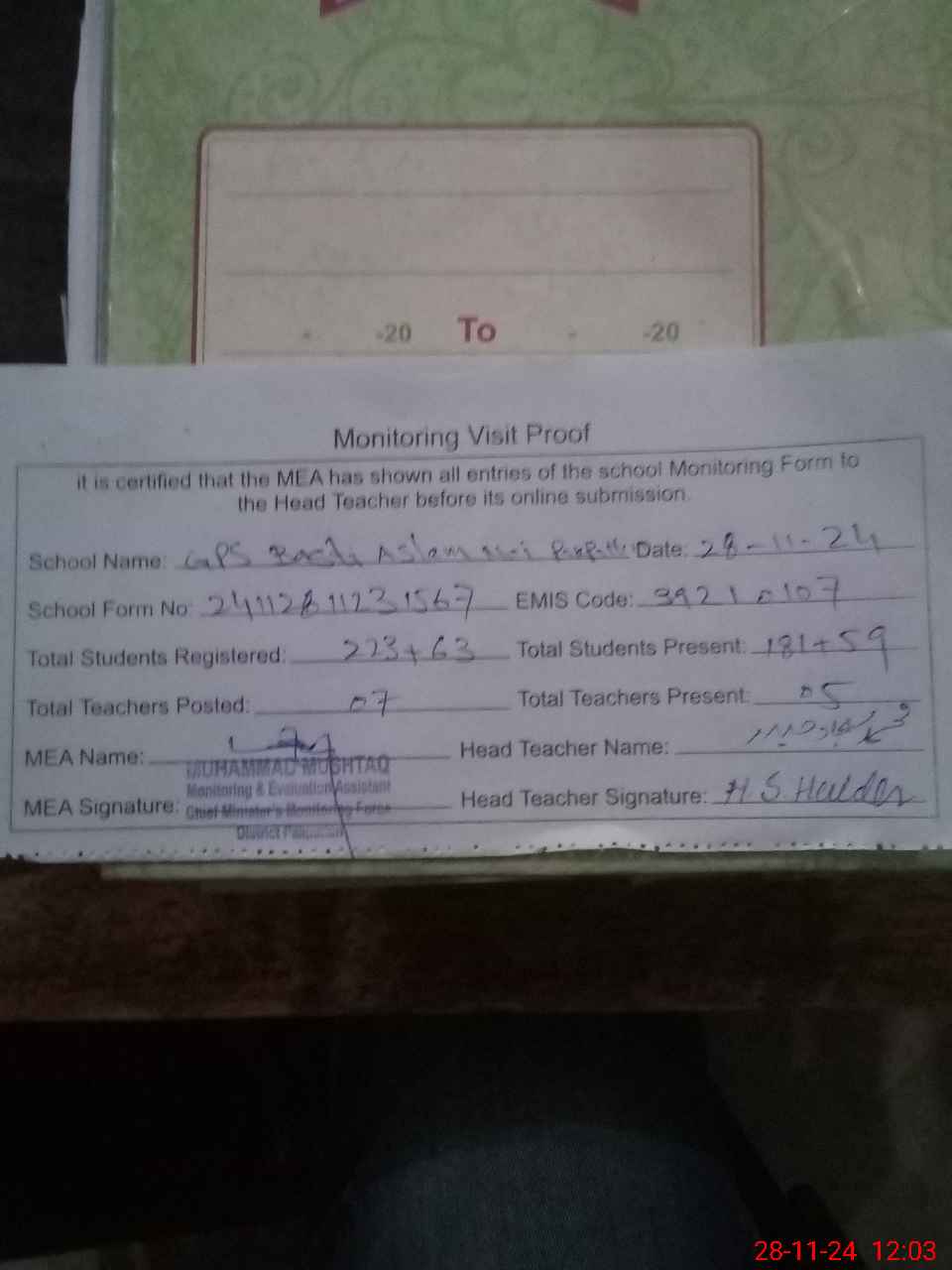 | Attendance Register | Head Teacher | MEA with School | Visit Proof |