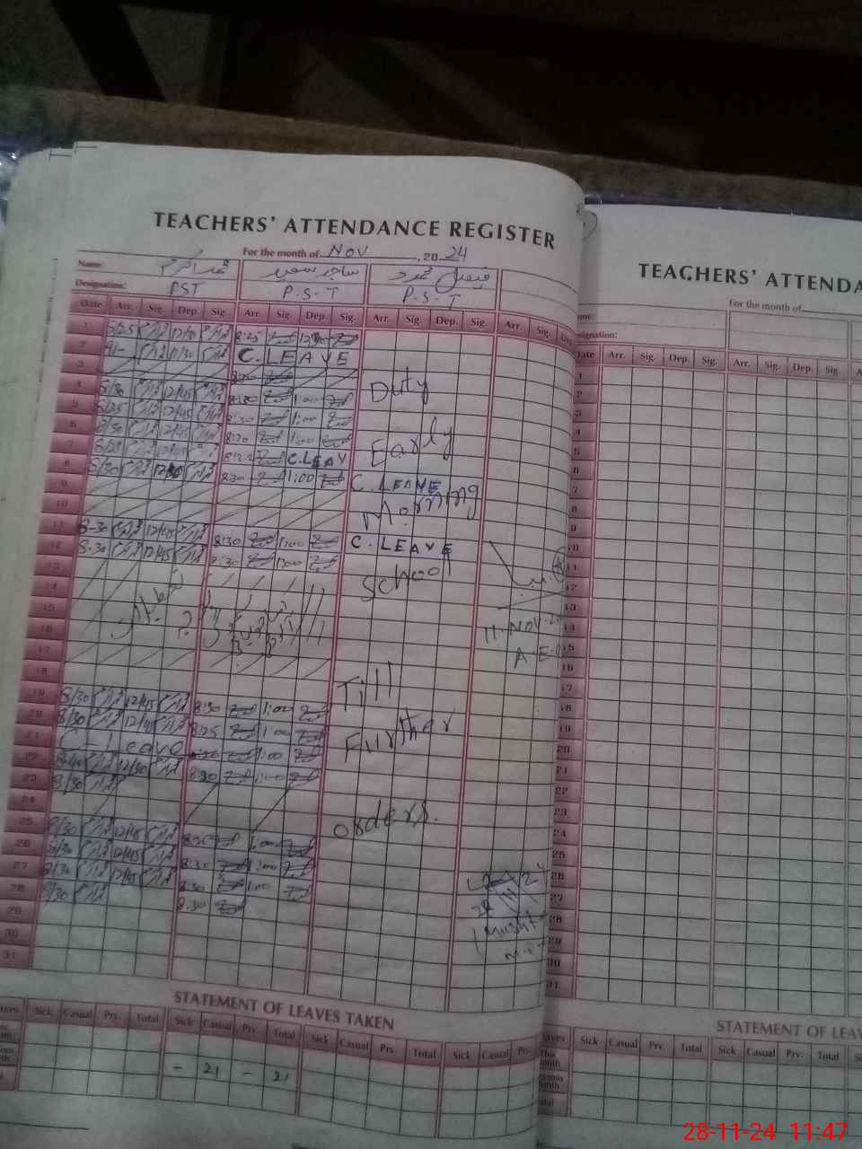 | Leave | Duty | Absent | Maternity | Medical | Ex- Pak |