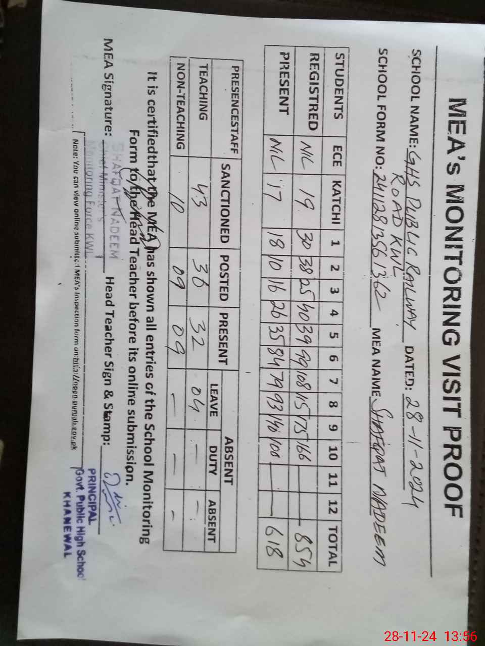 | Attendance Register | Head Teacher | MEA with School | Visit Proof |