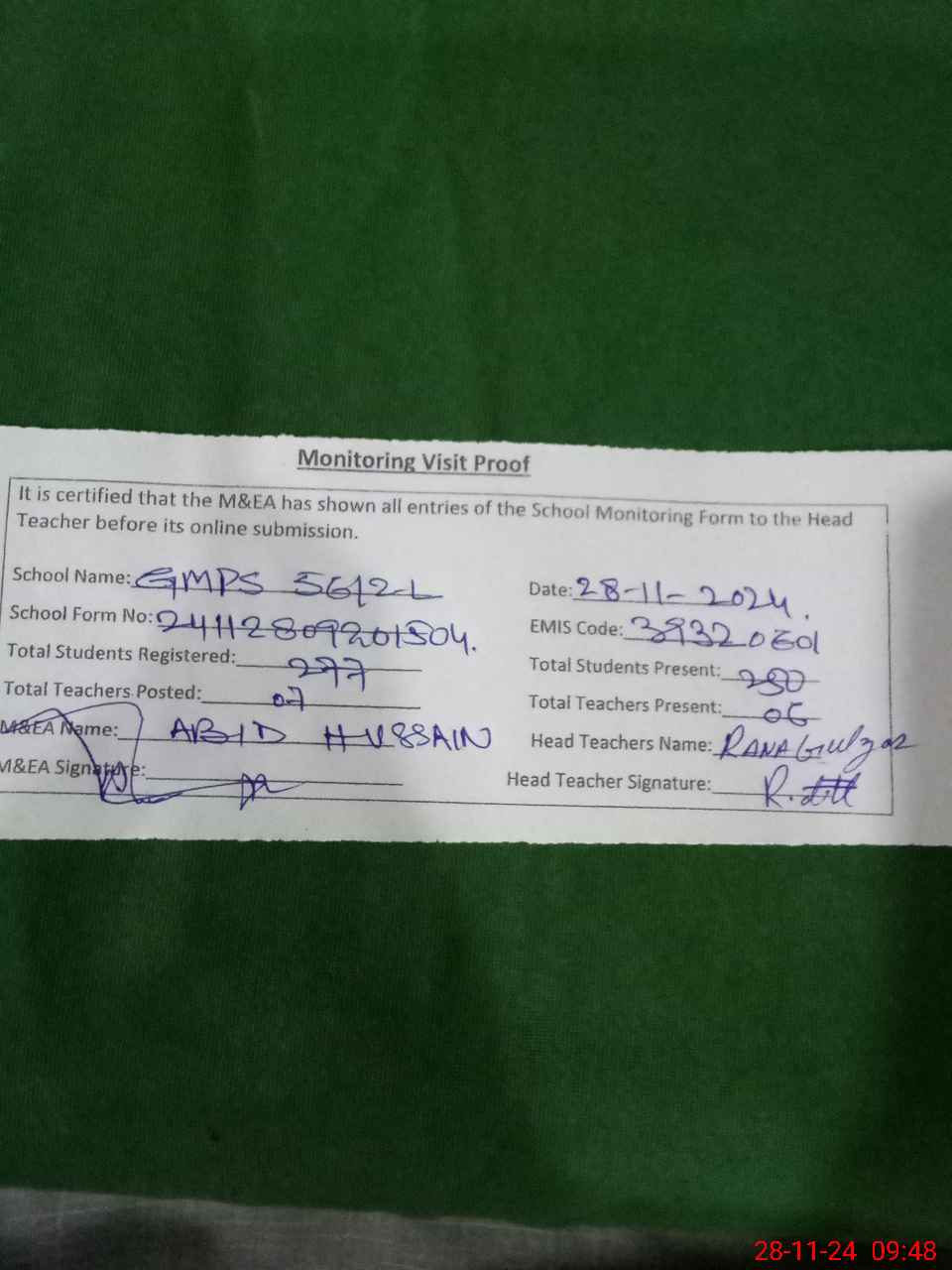 | Attendance Register | Head Teacher | MEA with School | Visit Proof |