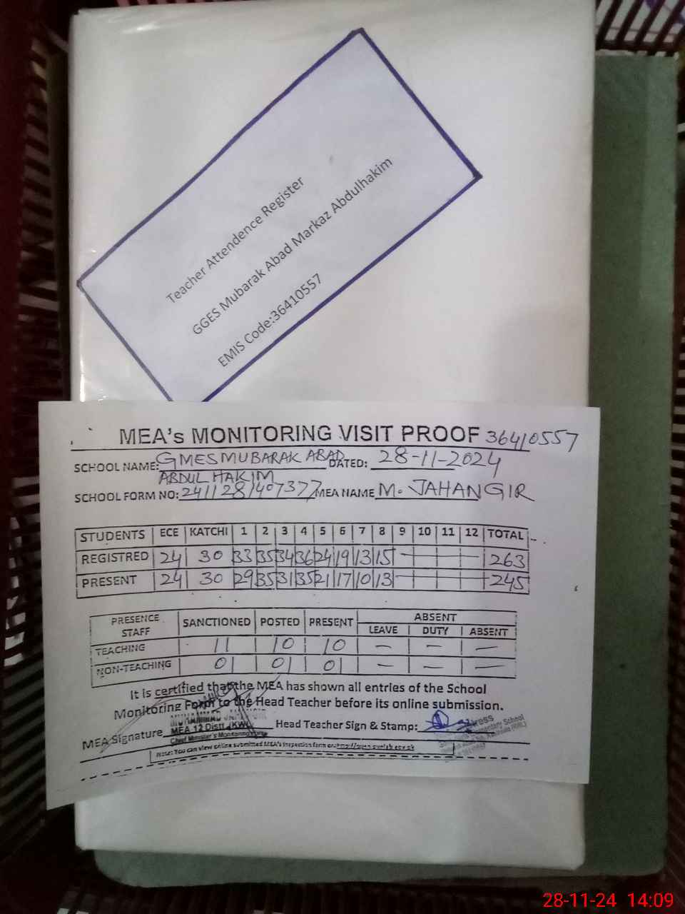 | Attendance Register | Head Teacher | MEA with School | Visit Proof |