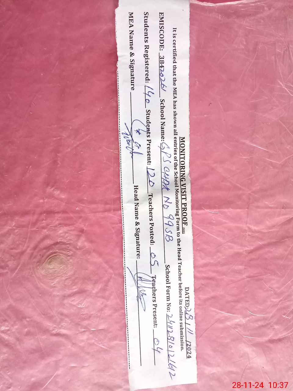 | Attendance Register | Head Teacher | MEA with School | Visit Proof |