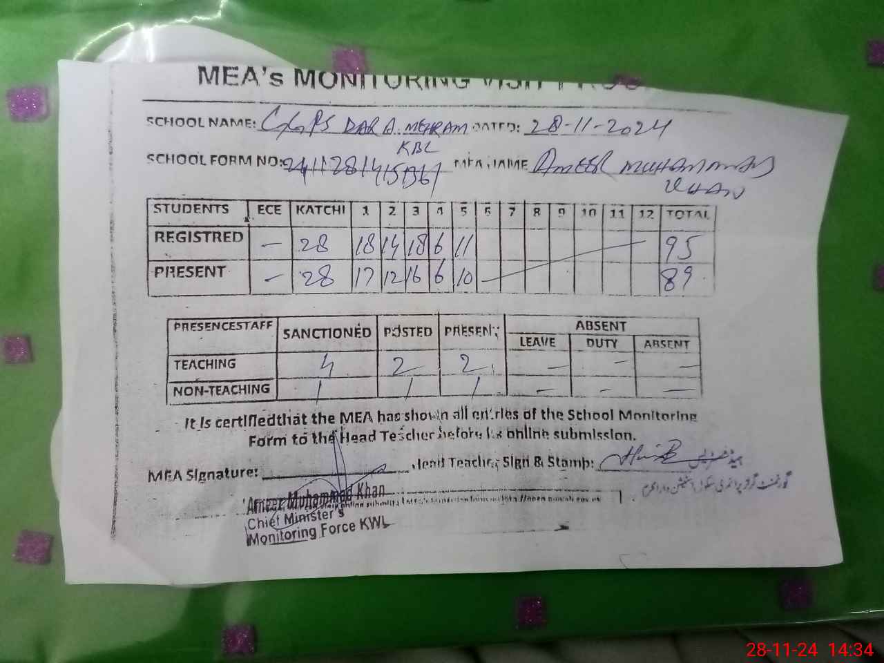 | Monitoring Date: 28-11-2024 | Start Time: 28-11-2024 02:15 PM | End Time: 28-11-2024 02:44 PM | Name of MEA: Am**** Mu**** Kh**** | |