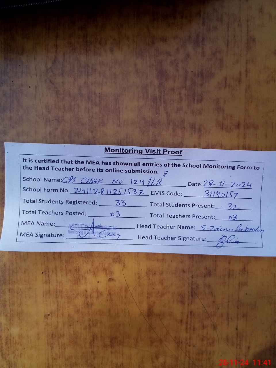 | EMIS Code: 31140157 | Name of School: GPS CHAK NO 124/6-R E | |||