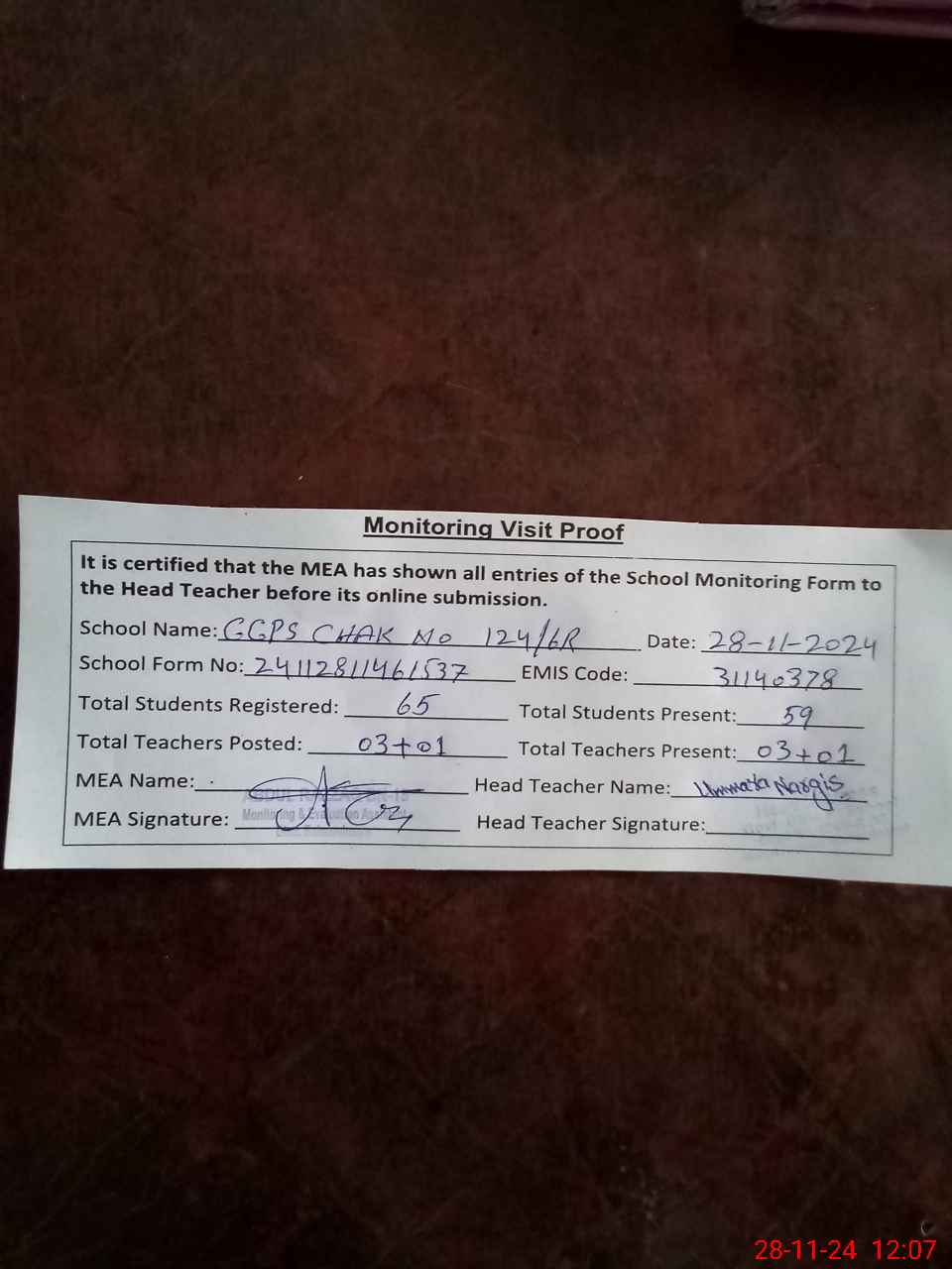 | Attendance Register | Head Teacher | MEA with School | Visit Proof |