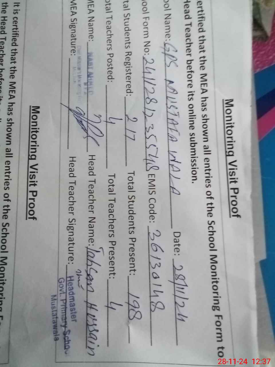 | EMIS Code: 36130148 | Name of School: GPS MUSTAFA WALA | |||