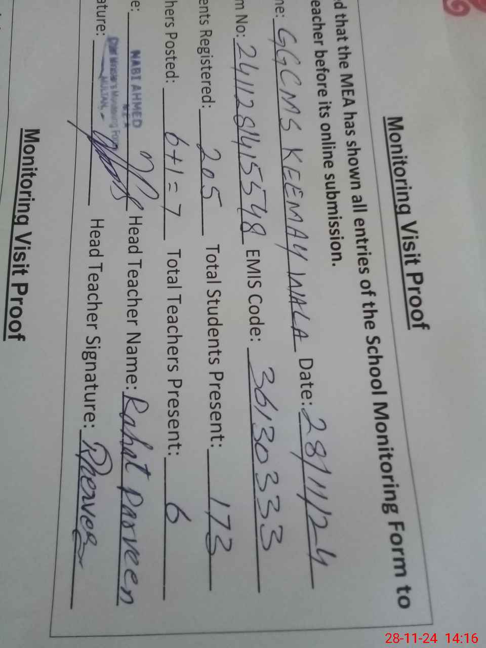 | EMIS Code: 36130333 | Name of School: GGCMS KEEMAY WALA BASTI NAU | |||
