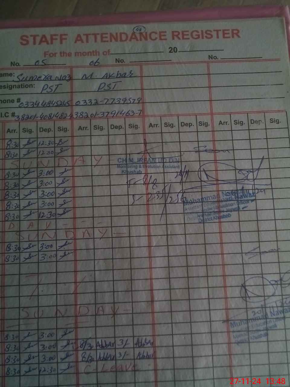 | CNIC | Full Name | Designation | R/C | Absence During Last Calender Month |