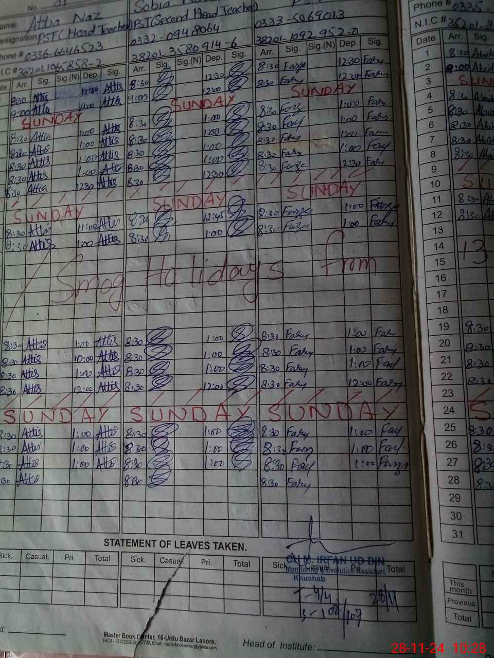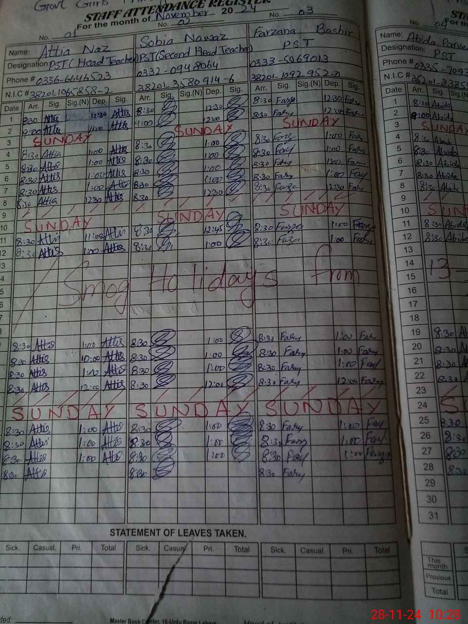 | CNIC | Full Name | Designation | R/C | Absence During Last Calender Month |