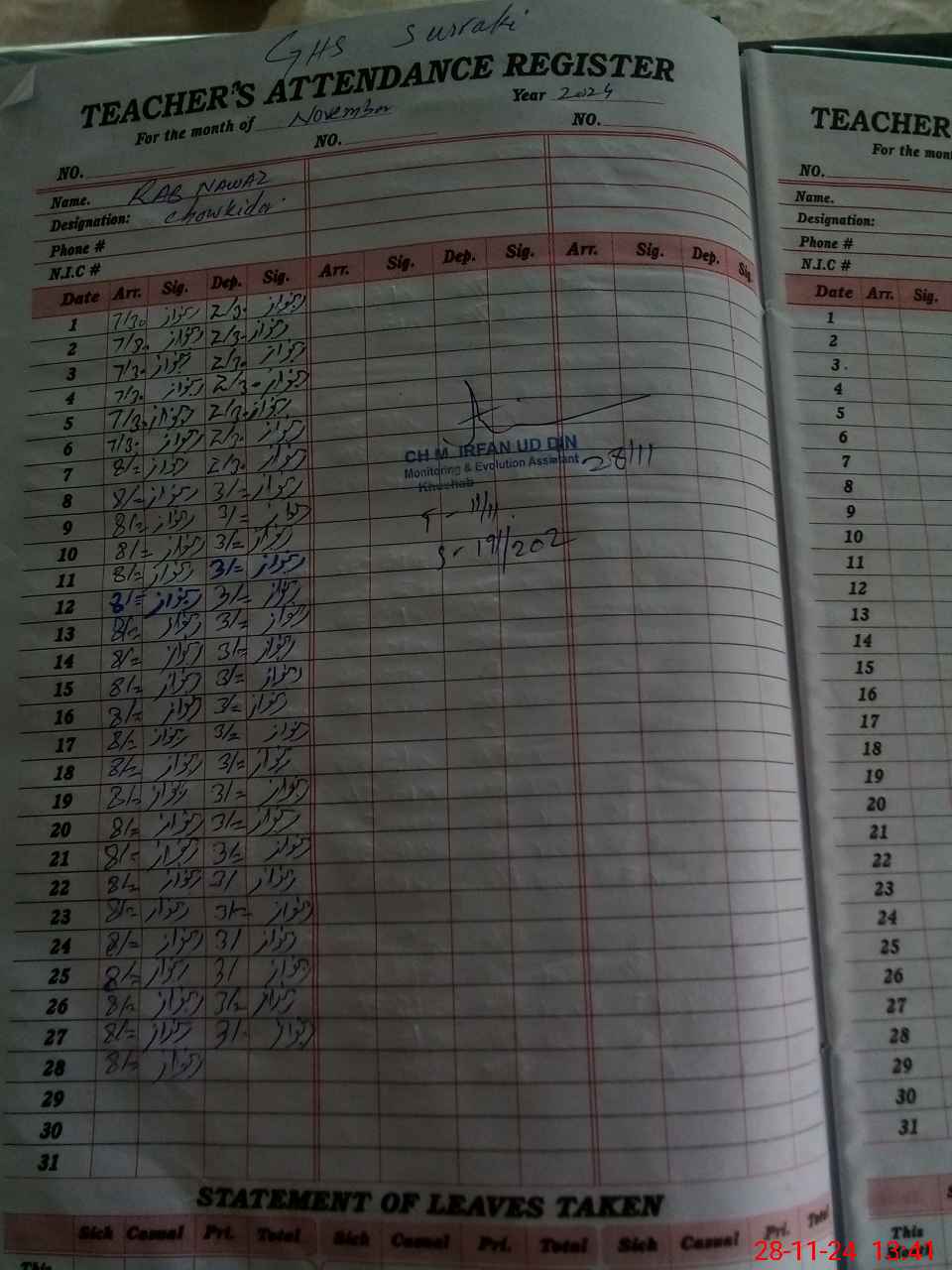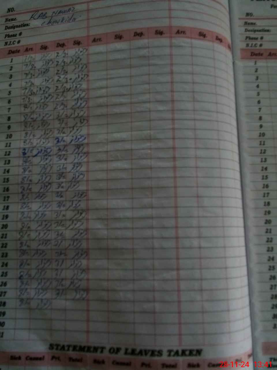 | CNIC | Full Name | Designation | R/C | Absence During Last Calender Month |